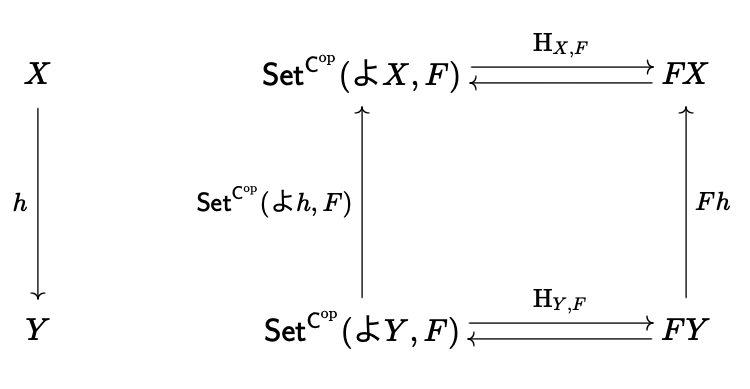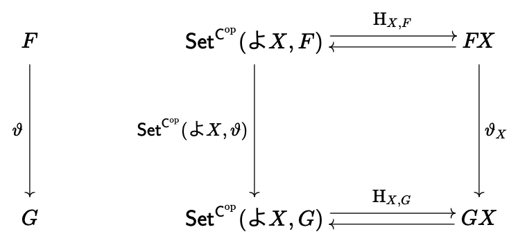 , we can define \vartheta_{x} : \yo X \Rightarrow F : \op{\cat C} \to \Set as follows: Given any π₯ β πΉ π , we define the component π β² ( π π₯ ) π β² : π’ ( π β² , π ) β πΉ π β² β β¦ ( πΉ β ) π₯ whose naturality condition is given by the diagram